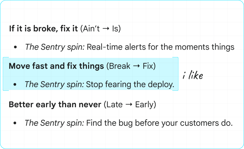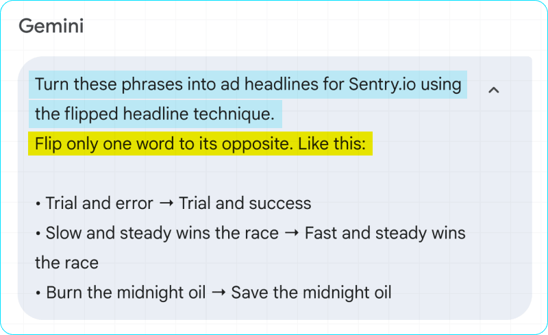 Hey! This is a Flipped Phrase headline: And another one from an insurance company. See the pattern? Let’s use this technique to write an ad for Sentry (software that helps devs find and fix bugs). Step 1: Find phrasesThe result should look something like this... Step 2: Flip themI go over the phrases and try to flip just one word to its opposite. I'm not there yet, so I ask AI for help. I actually like this one: The Silicon Valley cliché makes it more relevant to Sentry users. Step 3: Connect to the productI add a CTA and a logo. Here's my result. BonusAnd one more, for practice. You made it! 🕺Want to learn more about writing ads for tech companies? Check out my course here :) Talk soon, |