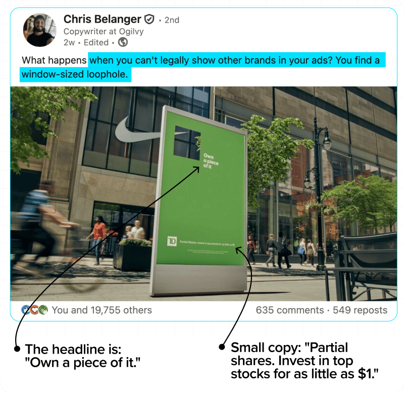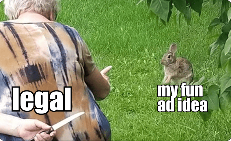 Hey! Legal restrictions often kill good ads. But sometimes, they inspire genius ideas, like this: Here's another one from this campaign: The RecipeI call these “Legal Loophole Ads,” and I think there are two main ways to come up with them: 1. Complain about your legal restrictionsI also love this classic from 1985: 2. Find a way around your legal restrictionsAnd another great example: Budweiser couldn’t use photos of rock stars drinking Bud because of copyright. So they invited people to google keywords that led to those iconic photos instead.